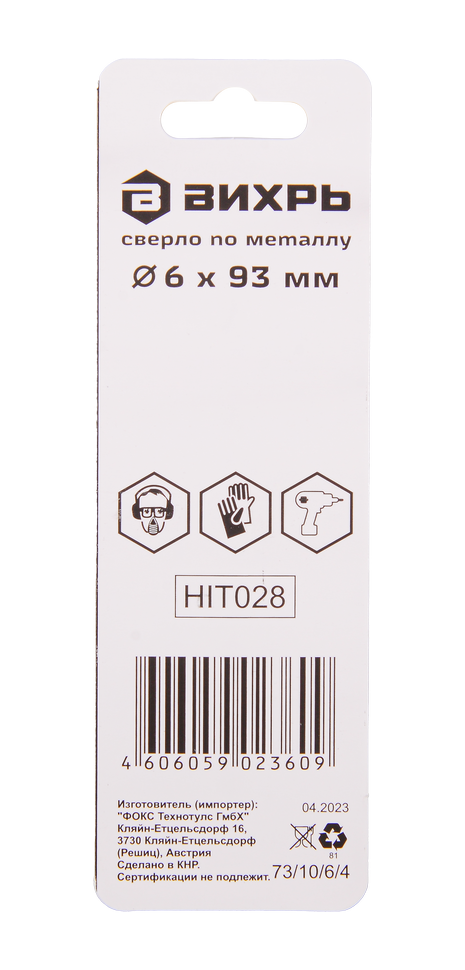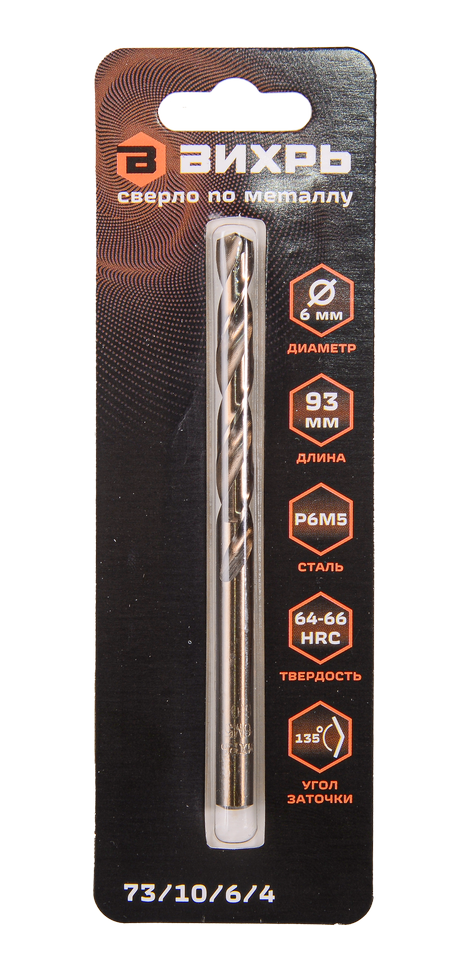 Сверло по металлу ВИХРЬ 6 мм, P6M5 используется для сверления отверстий диаметром 6 мм в металлических деталях. Длина сверла составляет 93 мм. Оно изготовлено методом вышлифовывания из высокопроизводительной быстрорежущей стали P6M5, что позволяет ему выдерживать значительные нагрузки. Для повышения тепло- и износостойкости сверло подверглось термо-химической обработке, благодаря чему получило желтый оттенок. Твёрдость – 64-66 HRC.