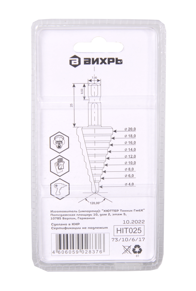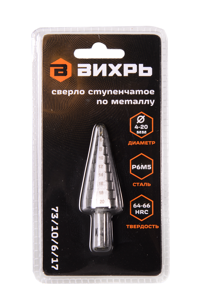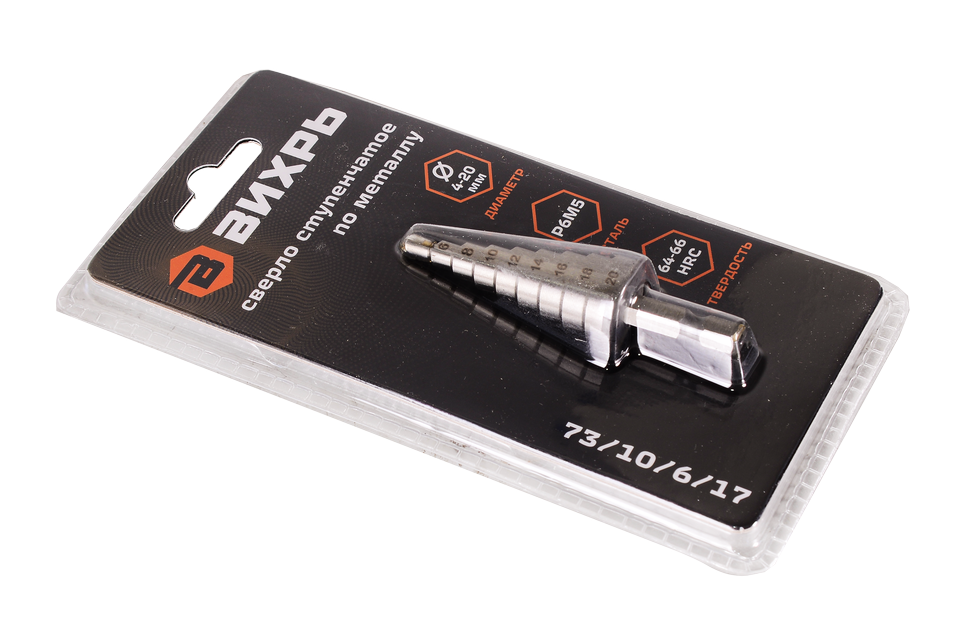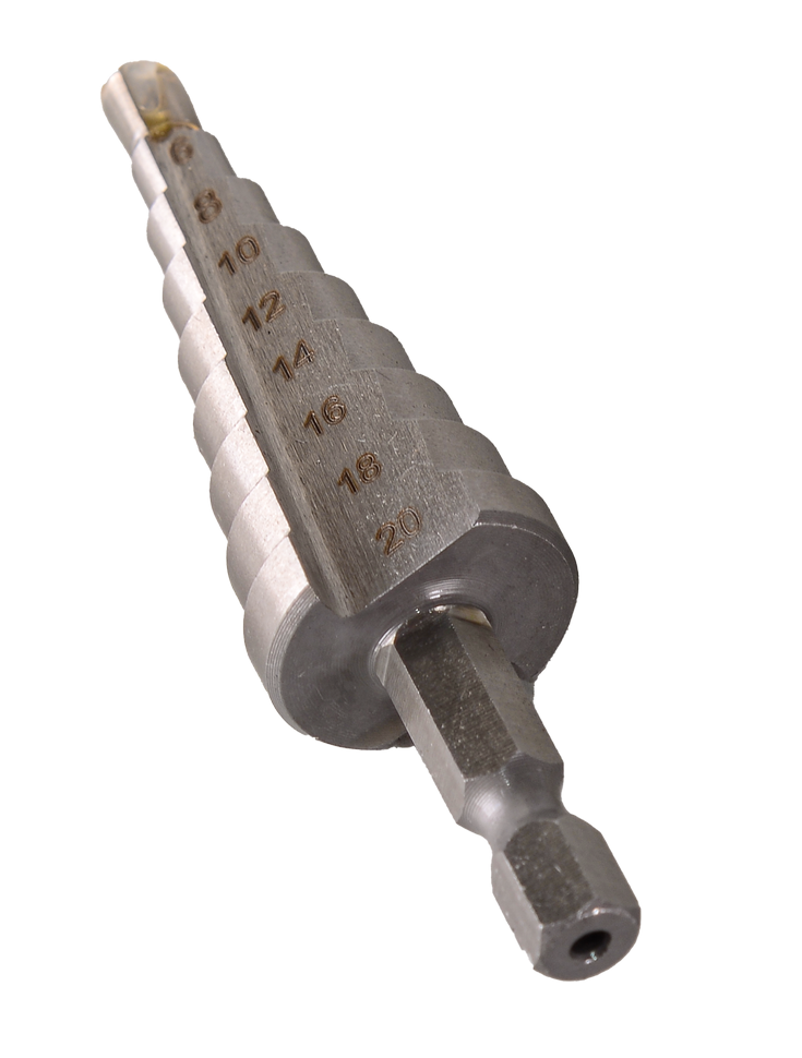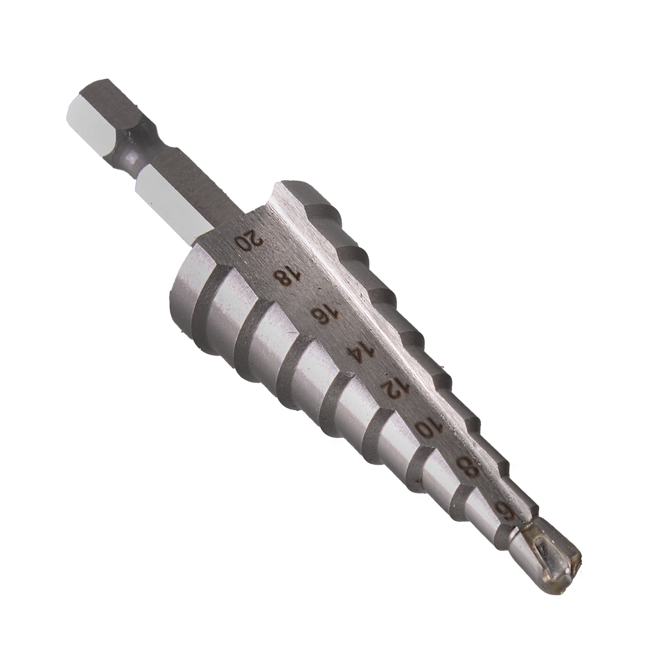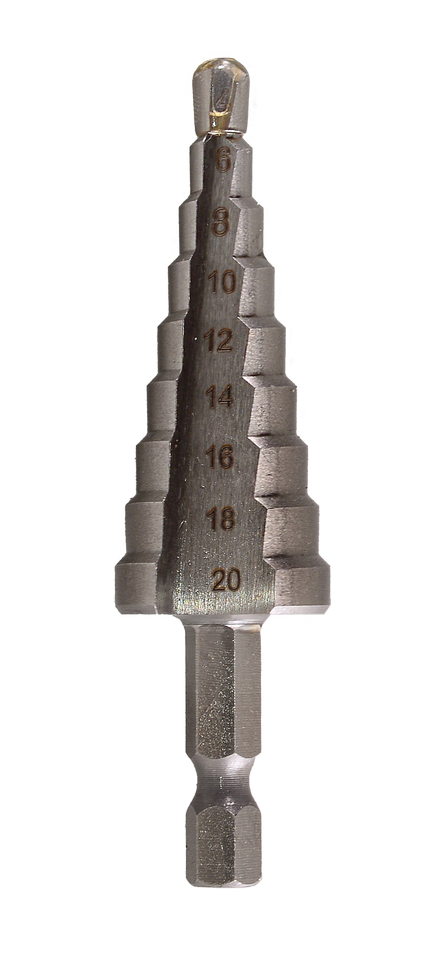 Сверло ступенчатое по металлу используется для сверления отверстий диаметром от 4 до 20 мм в металлических изделиях. Оно изготавливается из высокопроизводительной быстрорежущей стали P6M5. Имеет твёрдость 62 – 64 HRC.