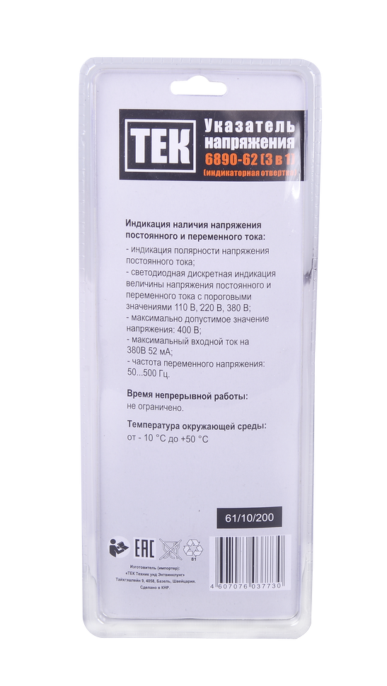 Тестер напряжения 6890-62 (3 в 1) используется для безопасной ступенчатой индикации напряжения электропитания и химических источников питания типа AA, AAA, C, D. Устройство выполнено в плоском пластмассовом корпусе с заизолированным конусным щупом. К тестеру прикреплен провод со вторым щупом. Этот тестер не определит обрыв электрической цепи. Индикаторами служат неоновые лампы.
