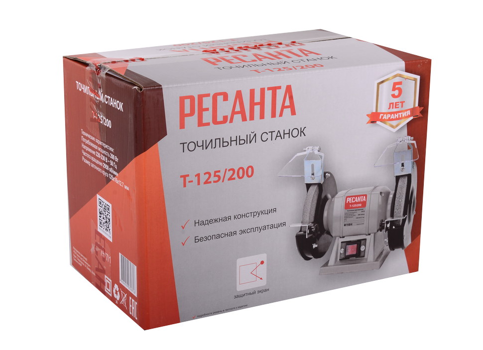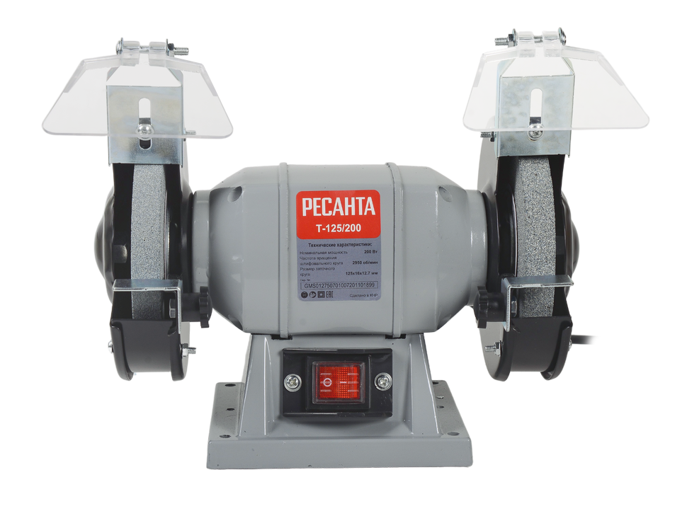 Точильный станок Ресанта Т-125/200 предназначен для профессиональной заточки режущих поверхностей. Асинхронный электрический двигатель мощностью 200 Вт позволяет использовать его для ножей, стамесок, ножниц, зубил. Максимальная скорость вращения шлифовального круга равна 2950 об/мин. Это обеспечивает высокую производительность и быстроту заточки. Размер круга составляет 125х16 мм. Модель выпускается с двумя установленными шлифовальными кругами типа А36 для грубой обработки металла и А60 — для более тонкой. Их посадочный диаметр равен 12,7 мм.