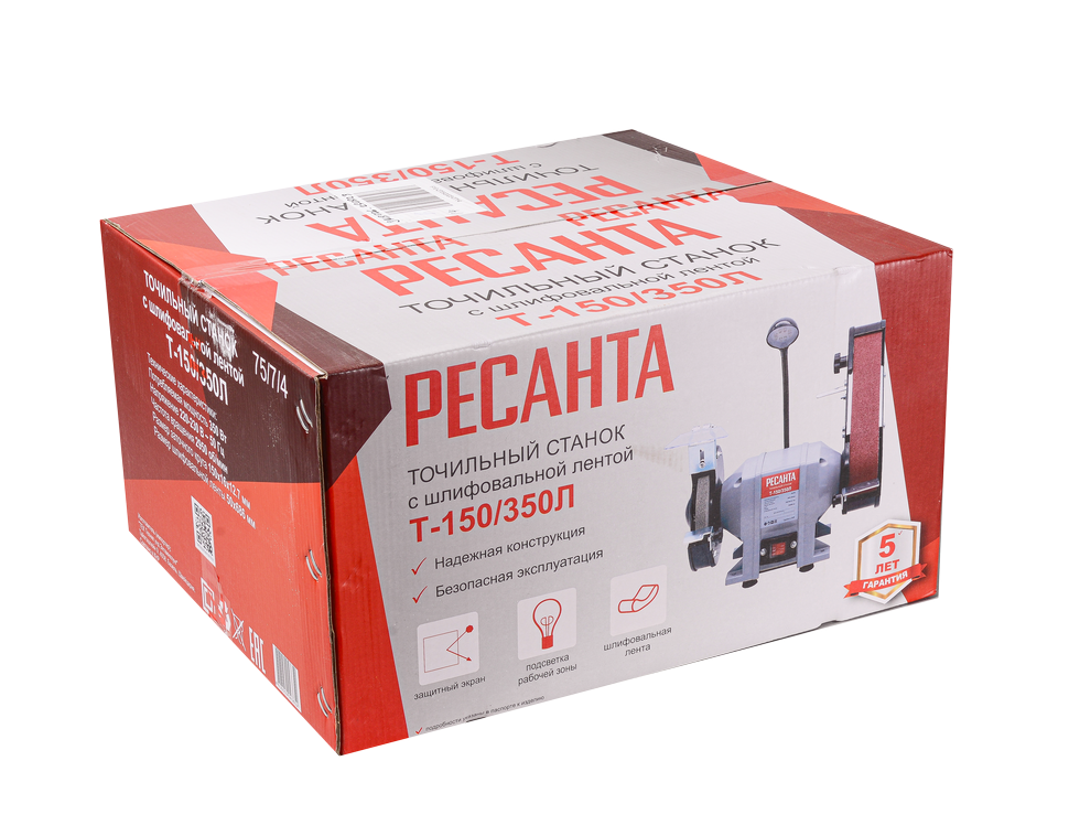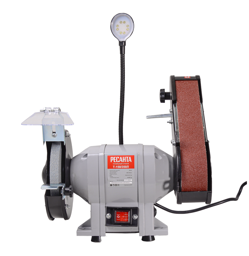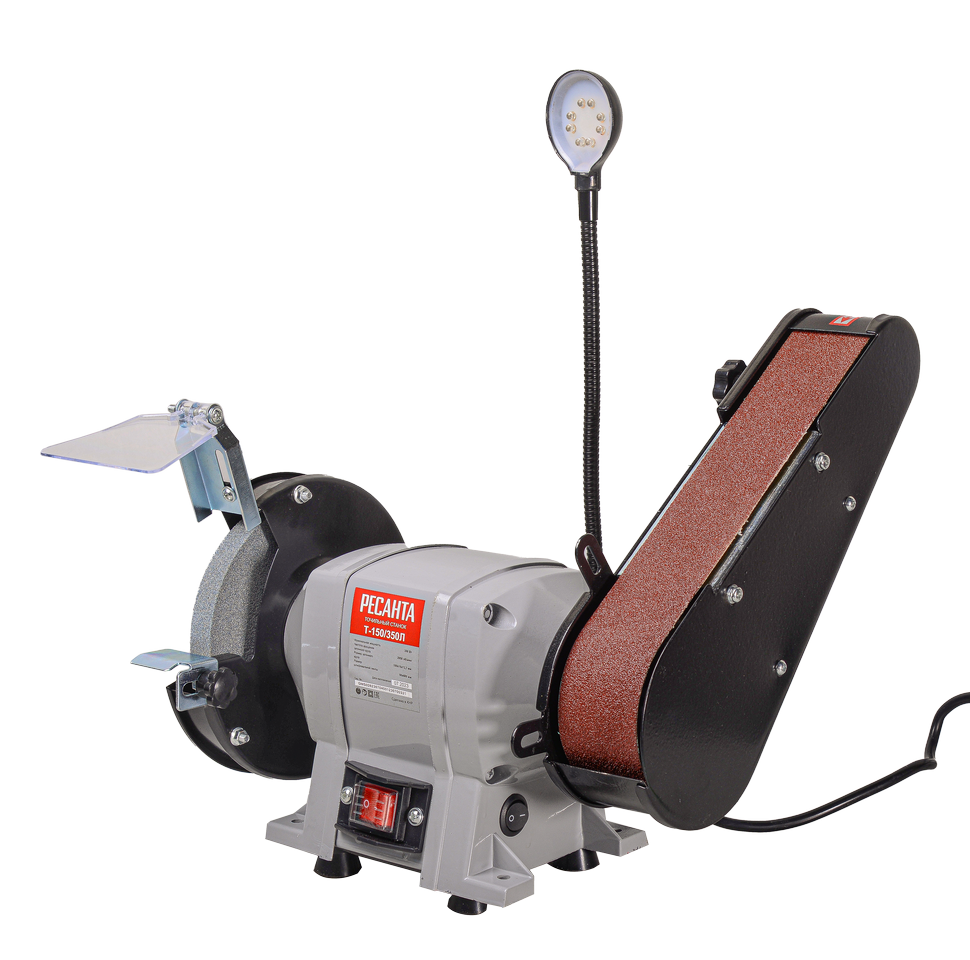 Точило работает от бытовой электросети. Асинхронный электродвигатель мощностью 350 Вт вращает вал со скоростью 2950 об/мин. Отверстия в станине позволяют фиксировать точильный станок к верстаку. Модель Ресанта Т-150/350Л оснащается светодиодной лампой на гибком основании для точечной подсветки рабочей зоны. Безопасность оператора во время работы обеспечивают защитный экран и искрогаситель, а рабочий упор предотвращает соскальзывание изделия.