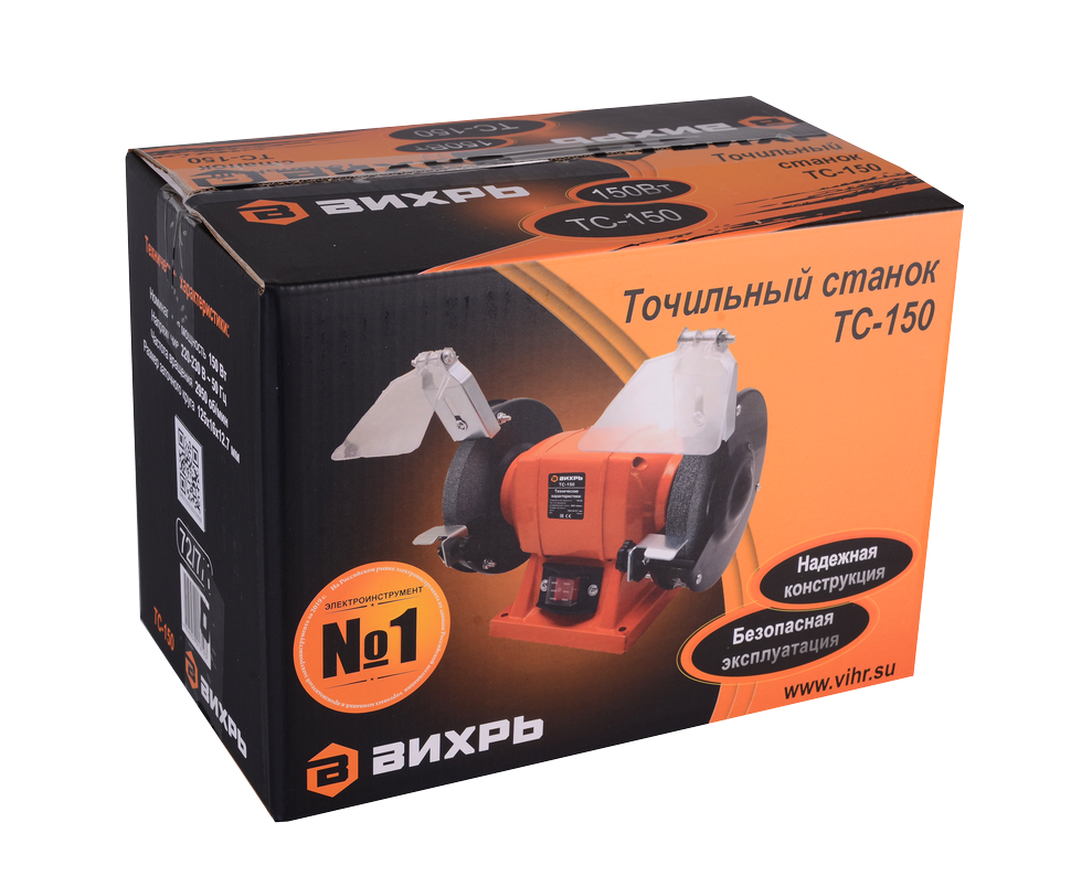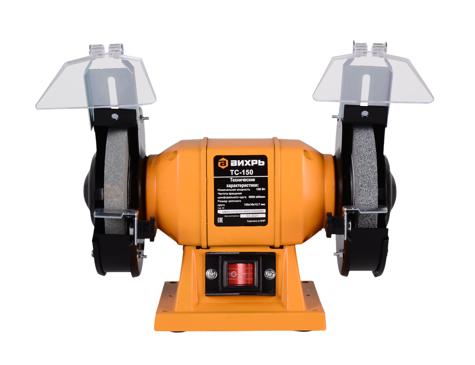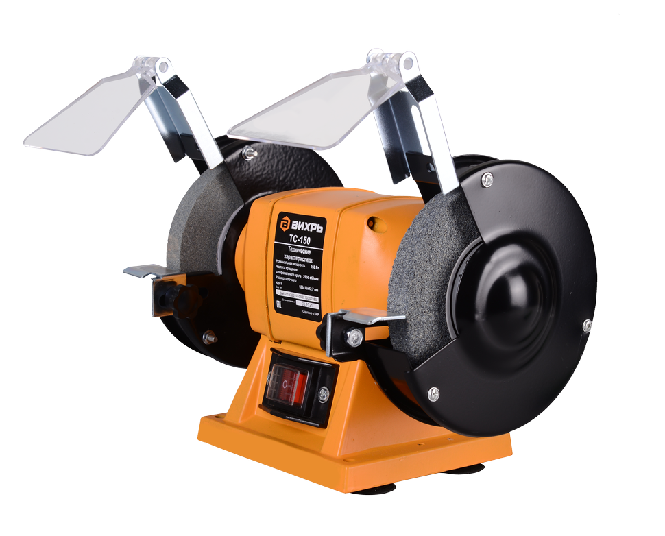 Модель точила, получившая название Вихрь ТС-150 является самой доступной в серии. Точильный станок работает от электропривода. Он оснащён электрическим двигателем с пониженным уровнем вибрации с закреплёнными на его валу шлифкругами. Для обеспечения безопасной работы имеются кожухи с надёжными искрогасителями, смотровыми экранами и специальными рабочими упорами. Двигатель имеет увеличенный рабочий ресурс. Его мощность составляет 150 Вт, частота оборотов – 2950 об/мин, что позволяет применять станок для решения широкого круга бытовых задач.
