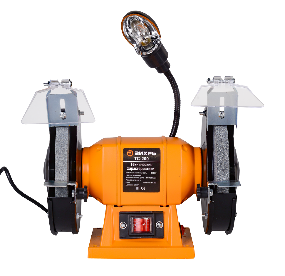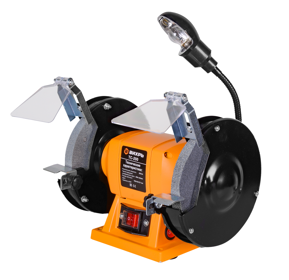 Помещен электромотор в корпус из алюминия. Для простого и удобного крепления, чтобы обеспечить надежную фиксацию в процессе работы, в корпусе предусмотрены отверстия. Чтобы обеспечить безопасность во время работы, на корпусе точила Вихрь ТС-200 устанавливаются защитные кожухи с искрогасителями, которые эффективно отражают большую часть окалины. Прозрачный защитный экран обеспечивает удобство и защиту во время работы. Также в комплектацию станка входят рабочие упоры, которые помогают удерживать изделия при заточке. Имеется и подсветка, которая значительно упрощает использование инструмента при недостаточном освещении.