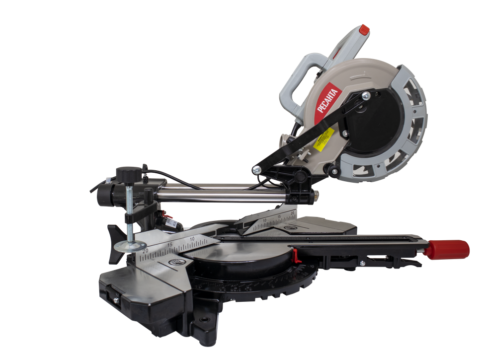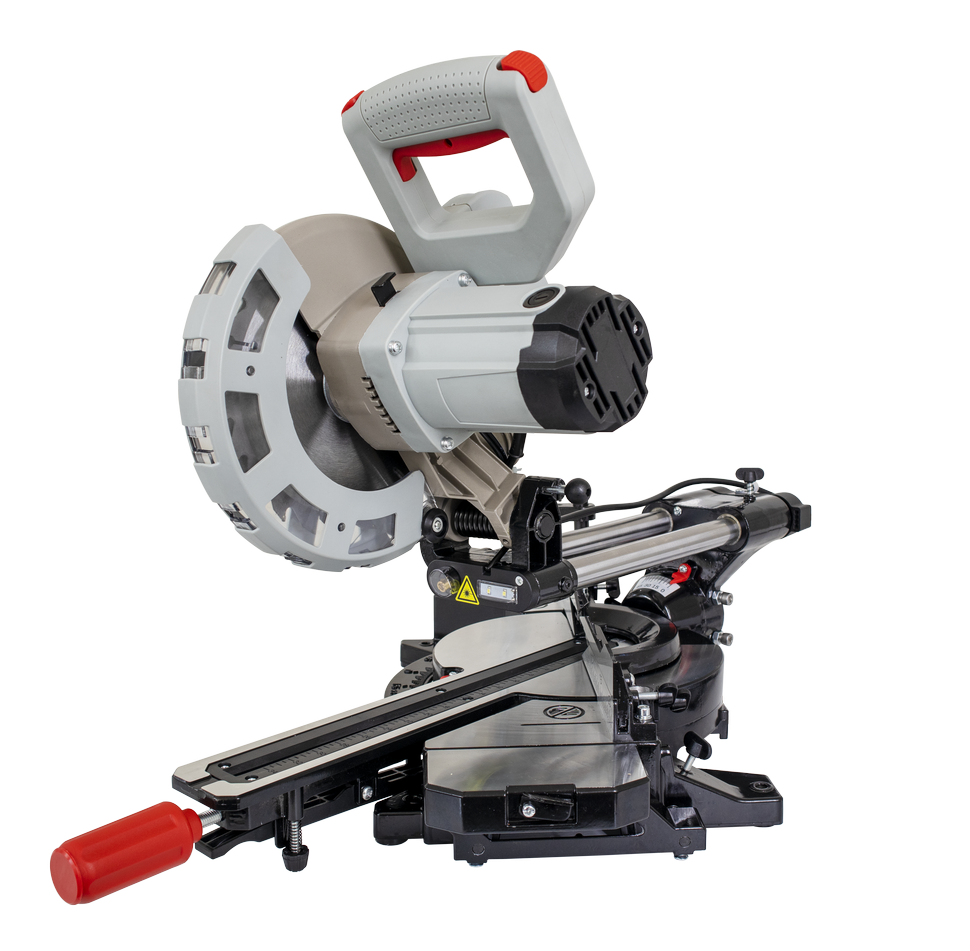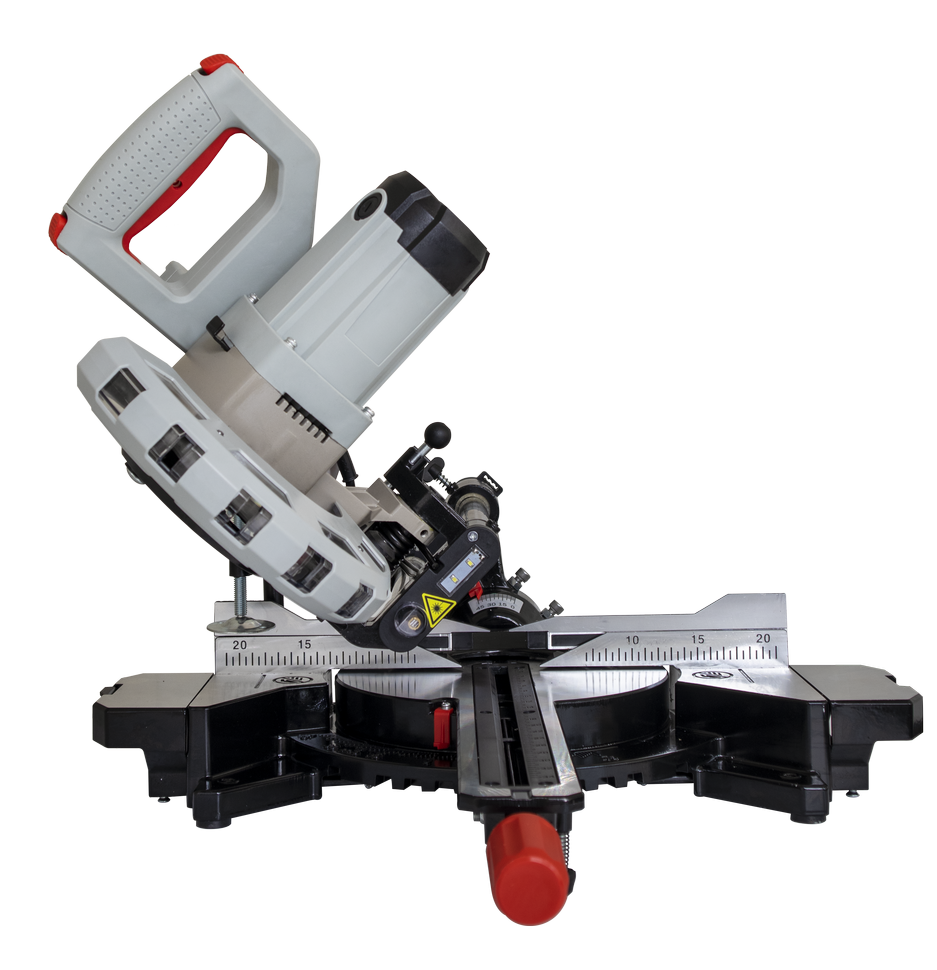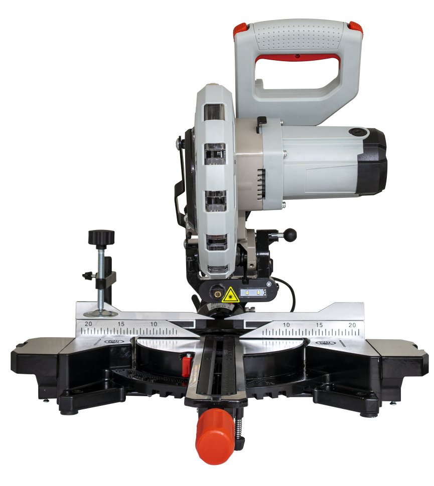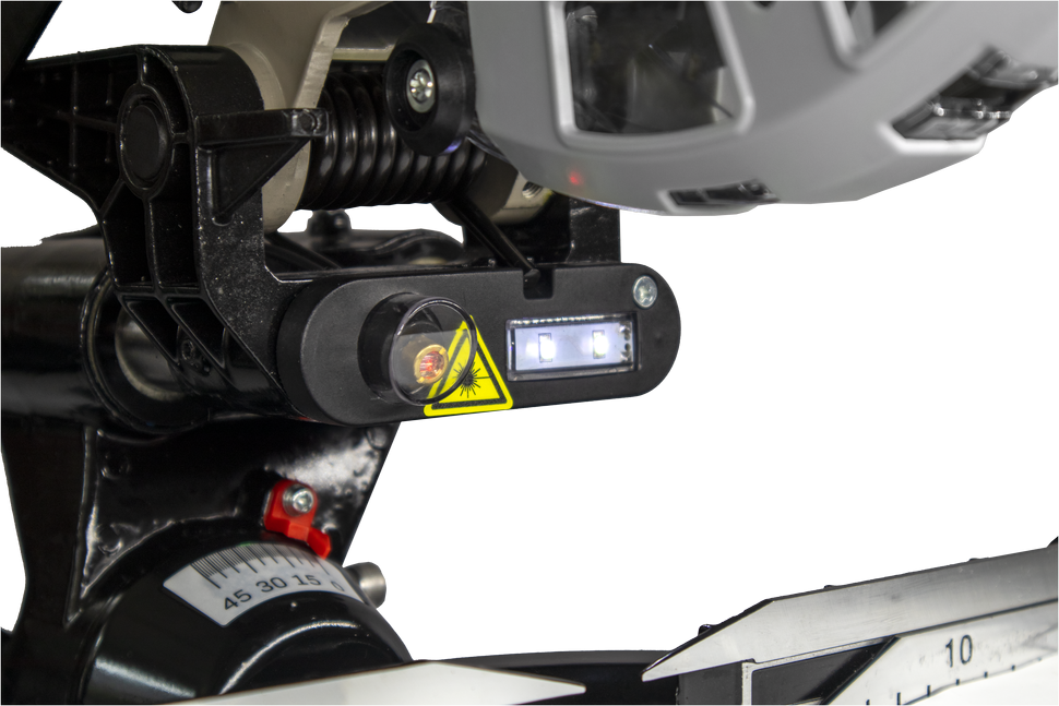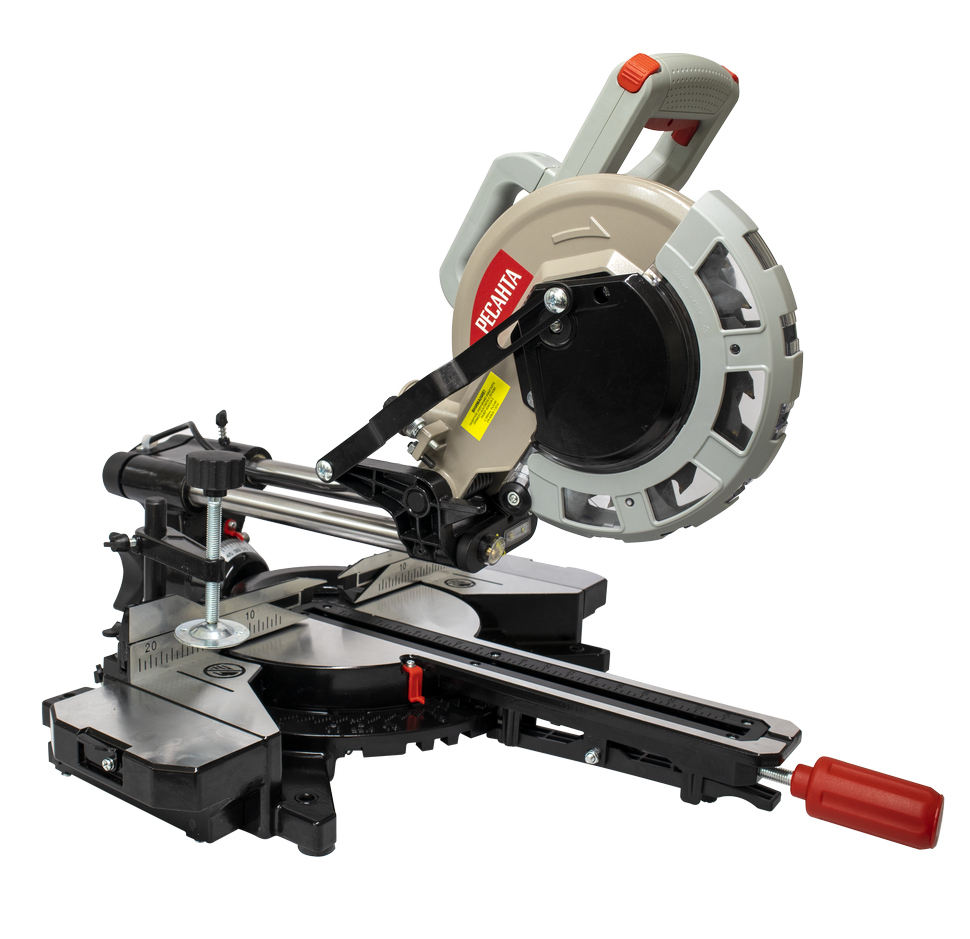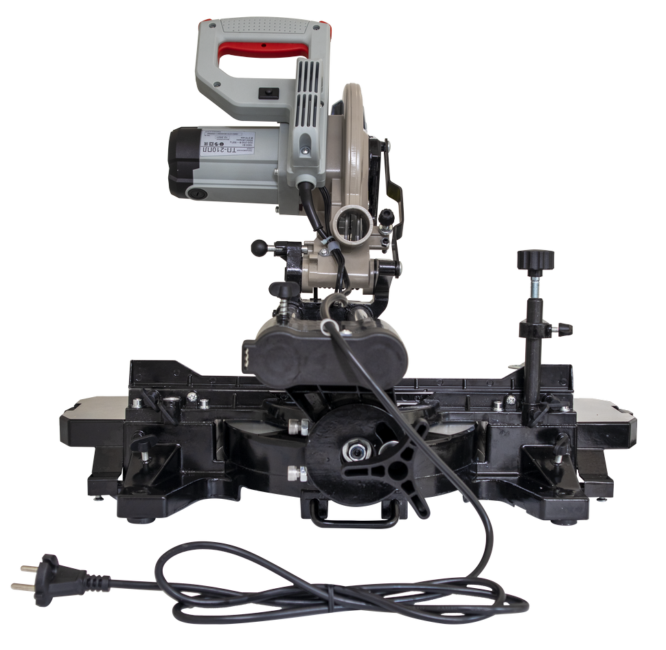 Торцовочная пила имеет прямой привод, номинальная мощность двигателя 1800 Вт. Вал редуктора защищен от случайного срабатывания, на время замены оснастки он блокируется кнопкой. Пильный диск 210 мм. Частота вращения диска в 5000 об/мин обеспечивает чистый и ровный срез. Для безопасности рабочего все подвижные режущие части закрыты защитными кожухами. Пыль отводится через патрубок в пылесборный мешок или пылесос.