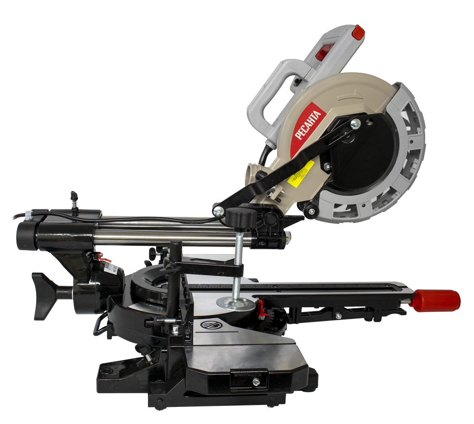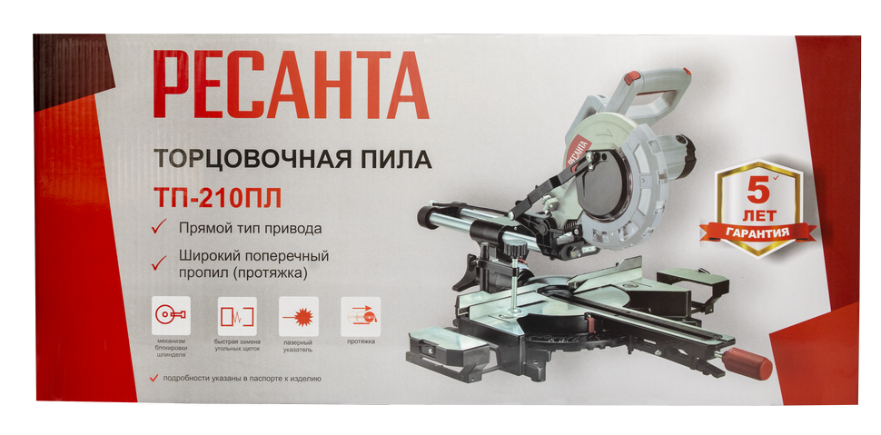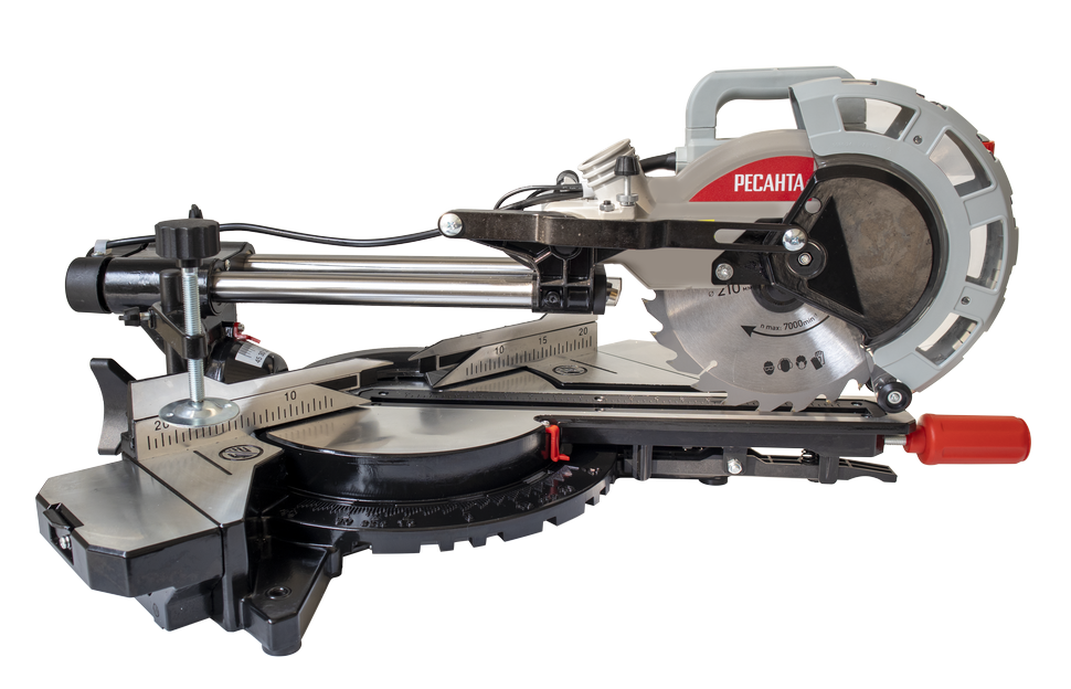 В модели Ресанта ТП-210ПЛ голова пилы подвижна, что позволяет выполнять поперечные, вертикальные угловые и комбинированные разрезы. Для заготовок большого размера есть функция пиления с протяжкой, расширители стола и надежная струбцина для фиксации. Ширина пропила доходит до 340 мм при выставленном угле 90° и не превышает 240 мм при 45°. Наибольшая глубина реза варьируется от 38 до 70 мм в зависимости от угла наклона. Для ее регулировки предусмотрены ограничители.