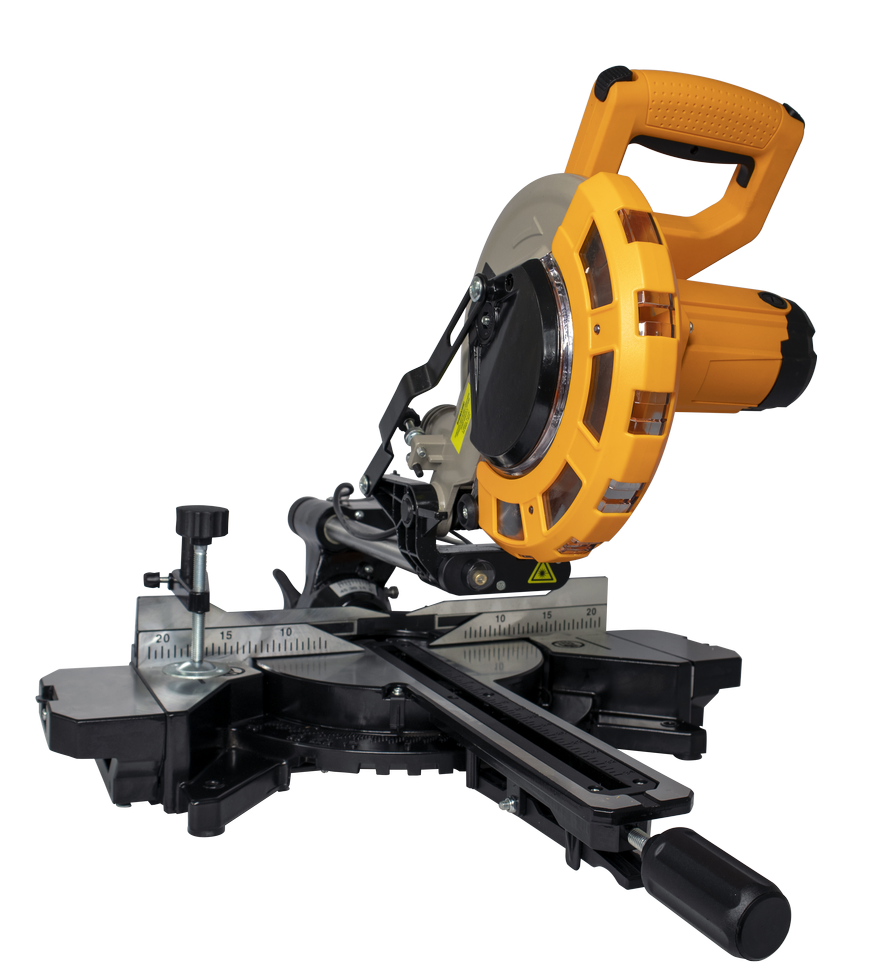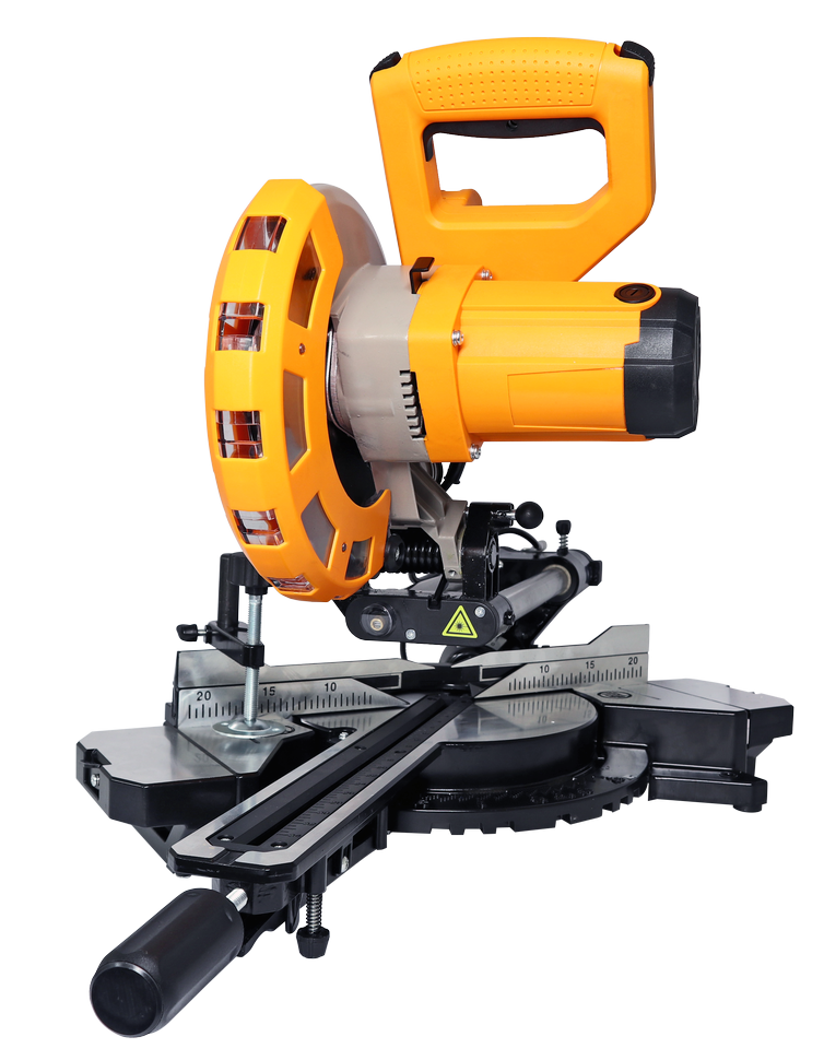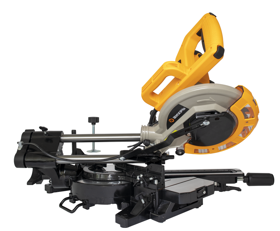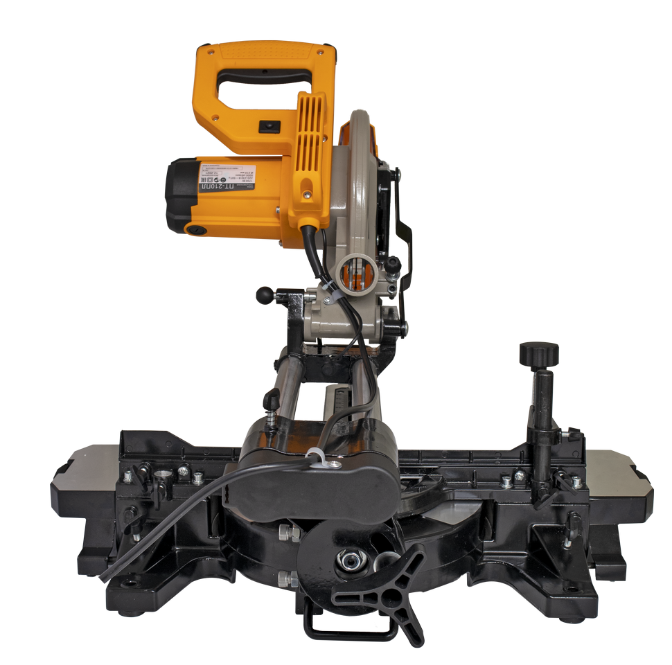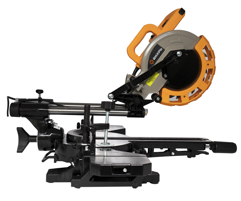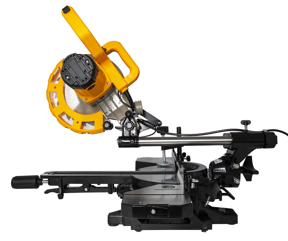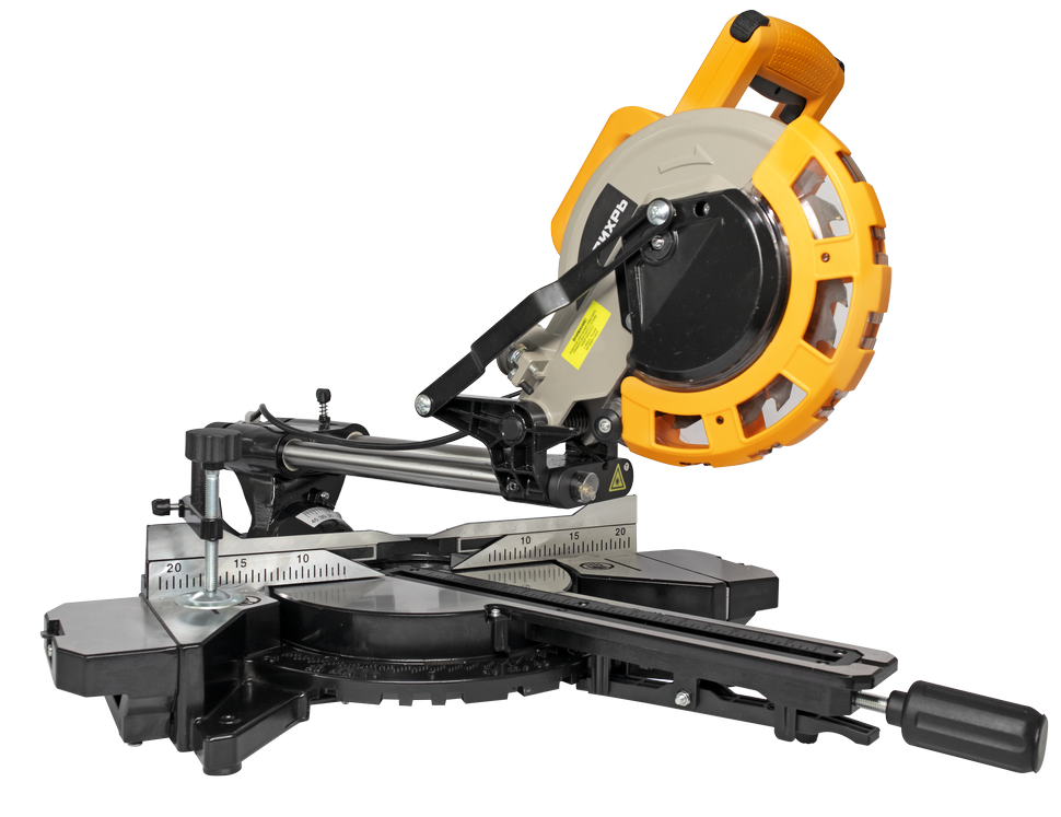 Работает торцевая пила данной модели от прямого привода электромотора мощностью 1700 Вт. Наличие лазерного указателя позволяет легко отметить линию реза, что обеспечивает высокую точность выполнения работ. Пила комплектуется П-образными расширителями, благодаря которым можно распиливать заготовки больших размеров. Для их надежного крепления используются струбцины. Наличие протяжки позволяет легко распиливать заготовки размером до 340 мм под прямым углом.