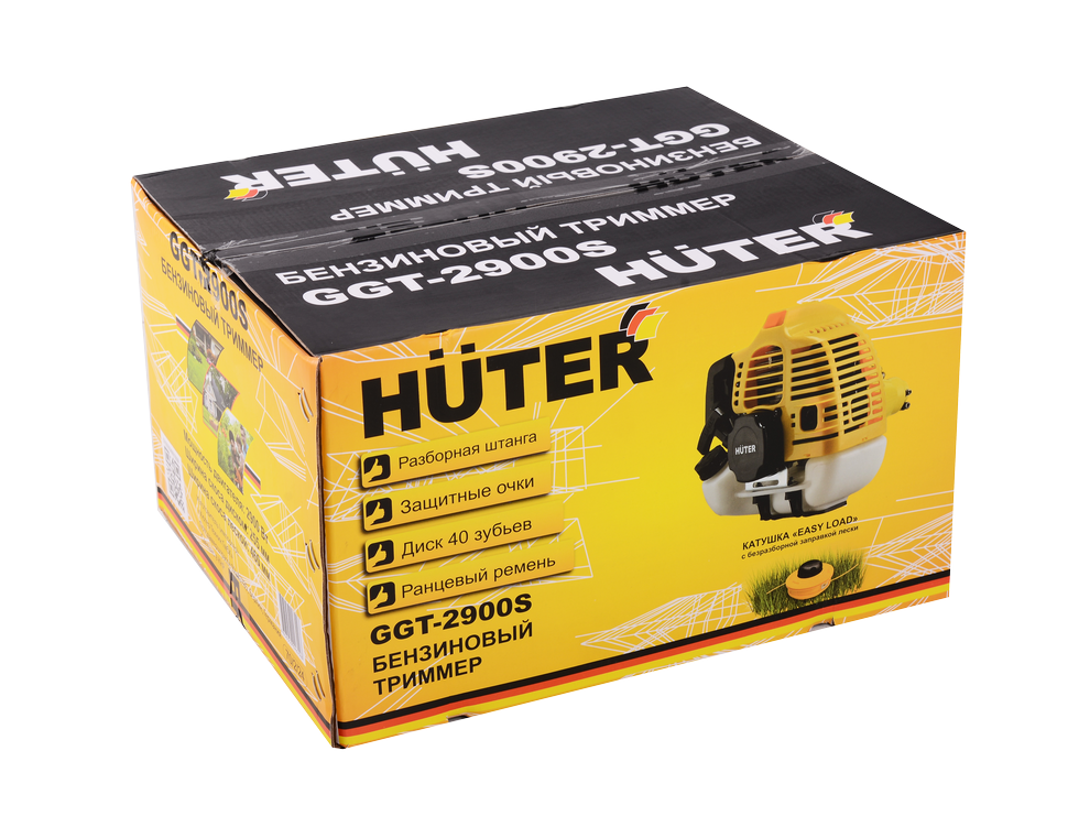 Комплектация бензинового триммера Huter GGT-2900S включает катушку «Easy Load» для выравнивания газона, а также диск 40ТР для спиливания древесной поросли. Это позволяет выбрать оптимальный тип насадки в зависимости от задач. Встроенный обрезчик лески помогает регулировать длину лески. Безопасность эксплуатации бензотриммера – обеспечивает прочный кожух и наличие в комплекте защитных очков.