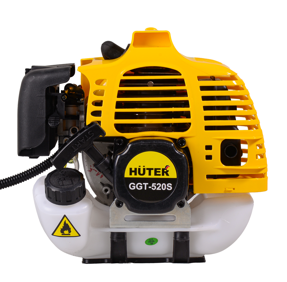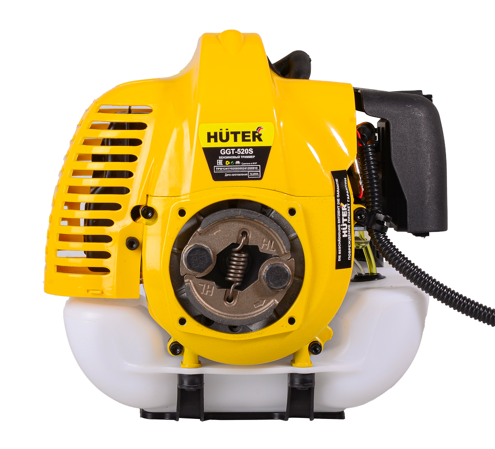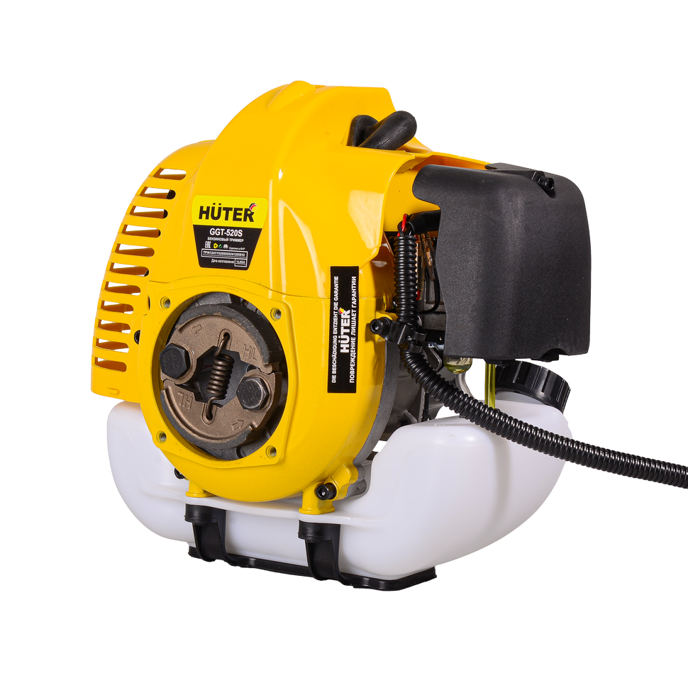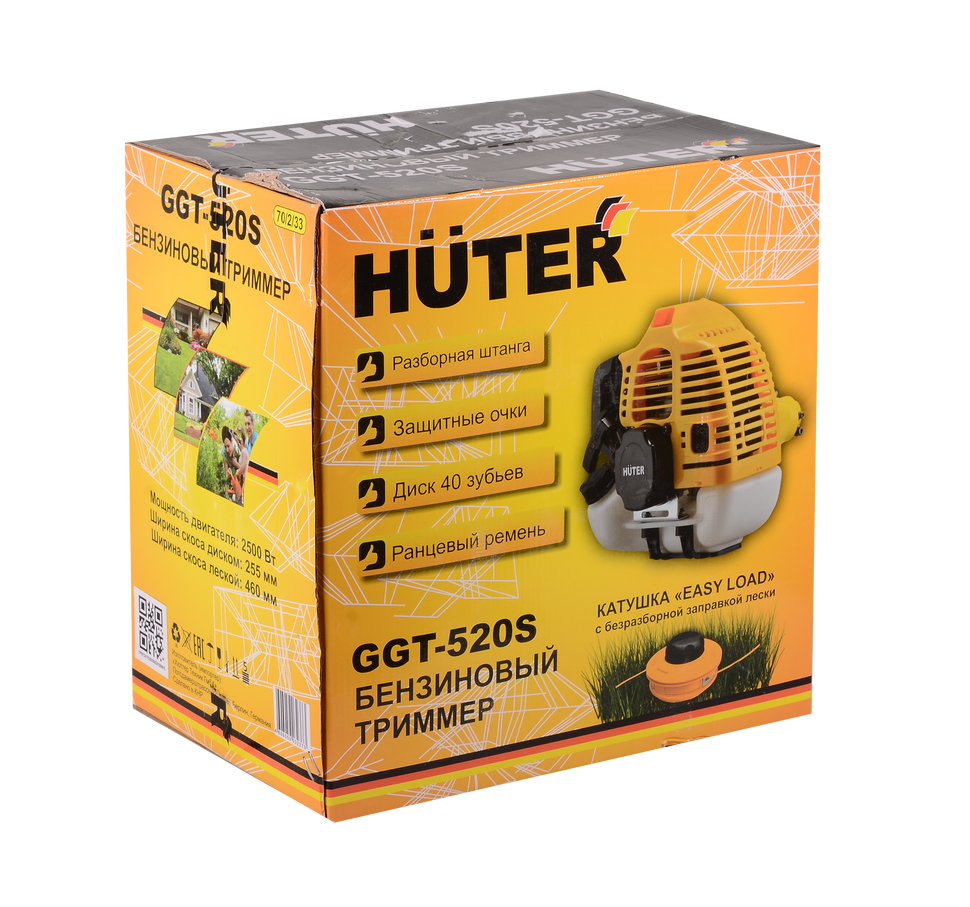 Бензиновый триммер Huter GGT-520S – отличный вариант для бытового использование и тех, кто не хочет переплачивать за излишнюю мощность. Он оснащён двухтактным двигателем мощностью 2500 Вт и системой воздушного охлаждения. Подходит для продолжительной работы на участках относительно большой площади. Режущим элементом триммера выступает леска или нож. Катушка «Easy Load» позволяет обрезать леску, не разбирая сам триммер. Диск 40ТР с твердосплавными победитовыми напайками справляется даже с древесной порослью.