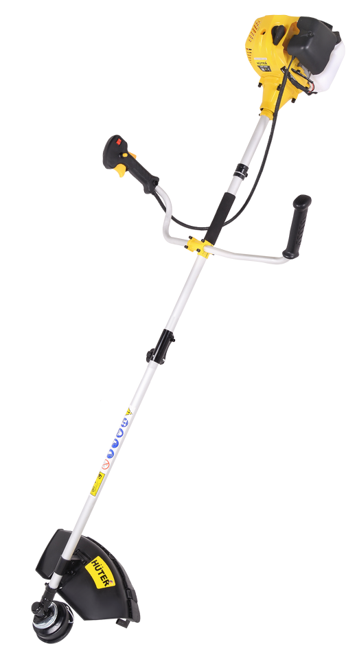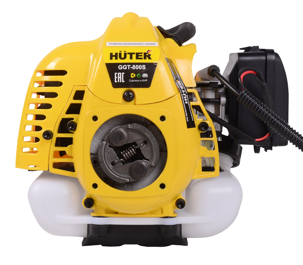 Huter GGT-800S оснащен двигателем двухтактного типа с воздушным охлаждением. Топливный бак рассчитан на 0.7 л., для заправки требуется смешивать бензин (не менее АИ-92) и масло. На бензиновый триммер установлена стандартная головка с леской и обрезчиком, позволяющим контролировать ее растяжение. 3-лопастной нож справляется с высокой травой и жесткой порослью, а защитный кожух оберегает пользователя от случайного попадания камней и мелкого мусора.