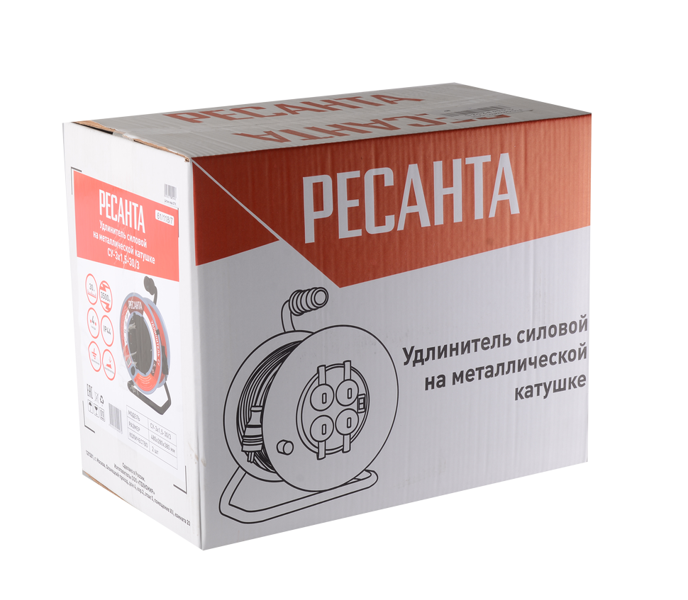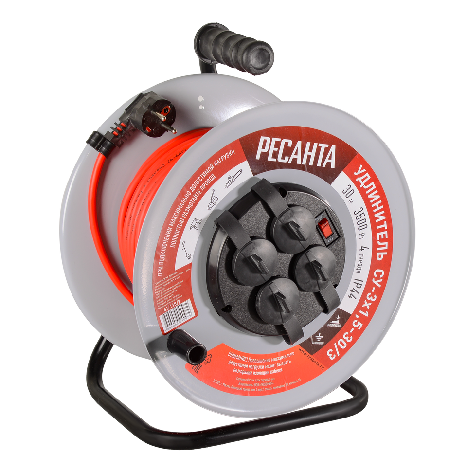 В модели Ресанта СУ-3х1,5-30/3 используется кабель ПВС с сечением 3х1.5 мм², что позволяет подключать потребителей высокой мощности: садовый и строительный электроинструмент, насосные станции и т.д. Если провод смотан в бухту, его пропускная способность не должна превышать 1,3 кВт, если размотан, то максимальная нагрузка может доходить до 3,5 кВт.
