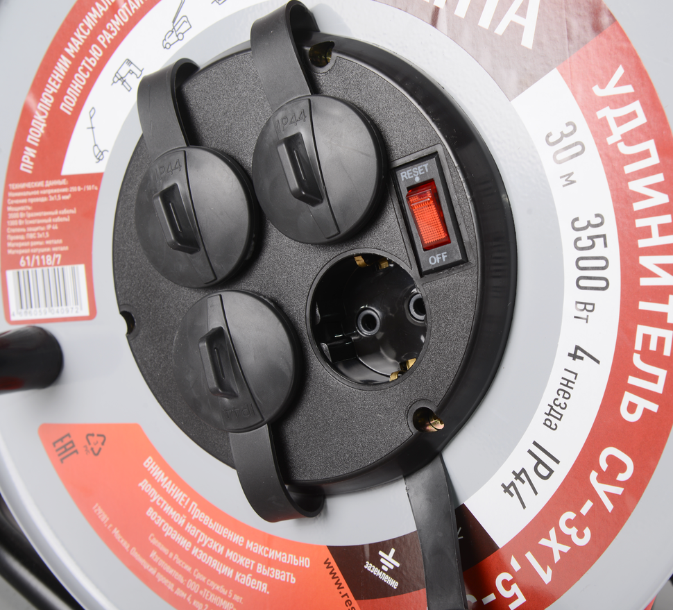 Силовой удлинитель подключается к электросети с помощью стандартной евровилки с заземлением. Блок розеток состоит из 4 гнезд с выключателем. Установленное тепловое реле защищает кабель от перегрева, вызванного перегрузкой. Розетки защищены от попадания пыли и влаги крышками. Класс защиты IP44.
