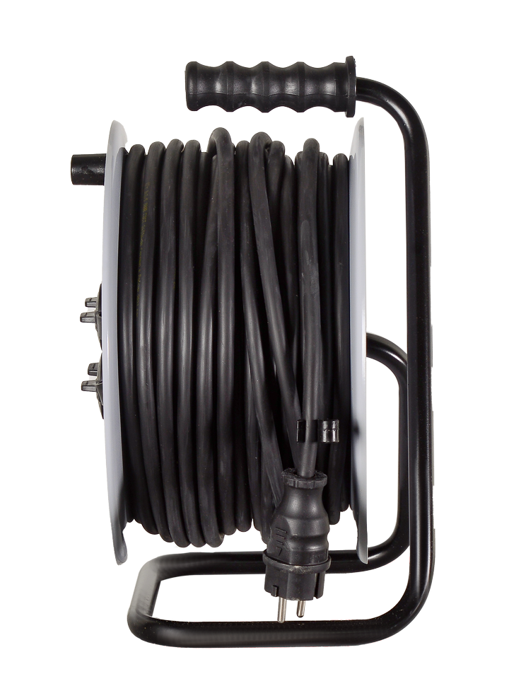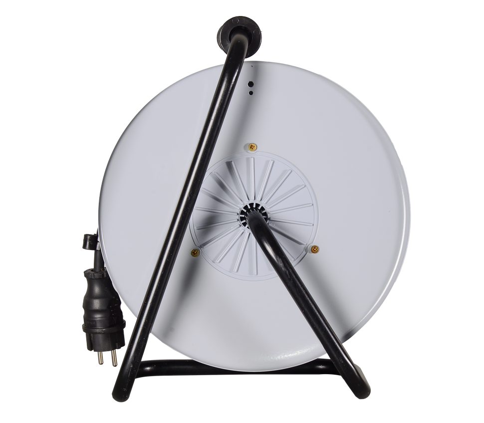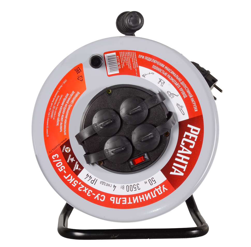 Металлическая катушка служит для хранения неиспользуемой части провода длиной 50 м. Она защищает от заломов и повреждений кабеля. В смотанном виде удлинитель обеспечивает мощность 1,3 кВт. Для подключения приборов с евророзеткой предусмотрено 4 разъема питания. Они снабжены защитными заглушками для безопасной эксплуатации. Общий выключатель позволяет обесточивать все приборы одним нажатием.