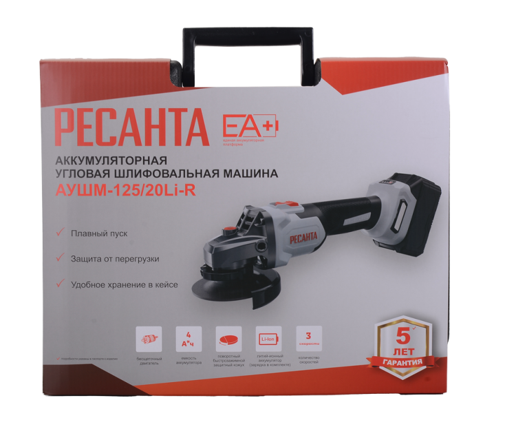 Углошлифовальная машина аккумуляторная Ресанта АУШМ-125/20Li-R (в комплекте 1 АКБ и ЗУ) ЕА+ в кейсе