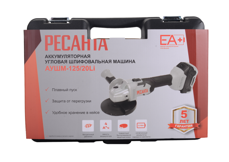 Углошлифовальная машина аккумуляторная Ресанта АУШМ-125/20Li (в комплекте 1 АКБ и ЗУ) в кейсе
