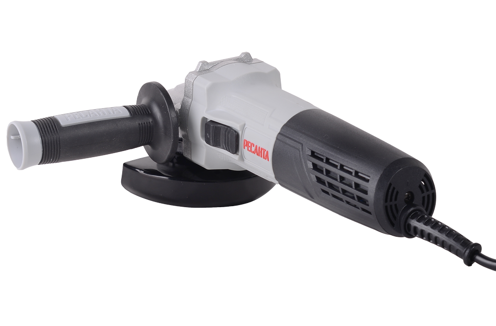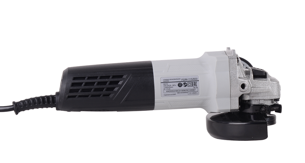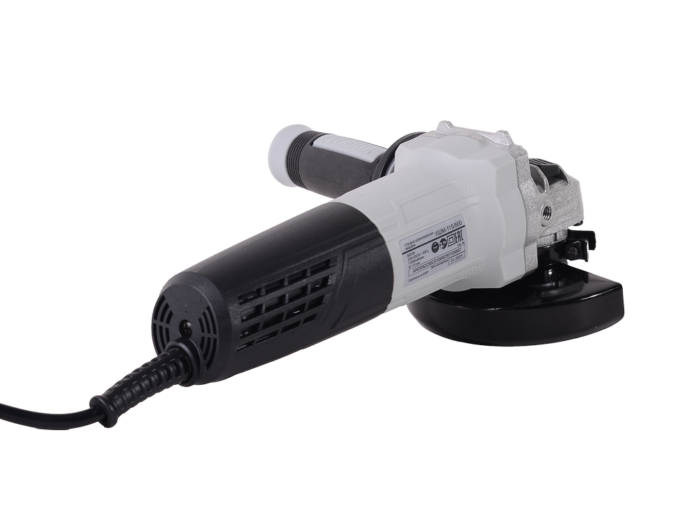 Угловая шлифовальная машина работает на электроприводе. Особенностью двигателя является наличие бронированного бандажа на роторе. Он обеспечивает защиту обмотки ротора, повышает степень надежности и срок службы инструмента. УШМ оснащена достаточно длинным кабелем (2 м) с двойной изоляцией. Мощность двигателя составляет 800 Вт, частота вращения остается неизменной (11000 об./мин). Устройство рассчитано на использование шлифовальных, полировальных и отрезных кругов диаметром 115 мм, а также зачистного инструмента (чашечных и дисковых щеток, лепестковых шлифовальных головок и пр.). Крепление производится путем закручивания прижимной гайки. Конструкция УШМ предусматривает наличие технических отверстий в корпусе для вентиляции двигателя, а также рукоятки Компакт, которую можно фиксировать в 2 позициях для удобства работы в разных положениях. Клавишный выключатель минимизирует риск случайного запуска электродвигателя.