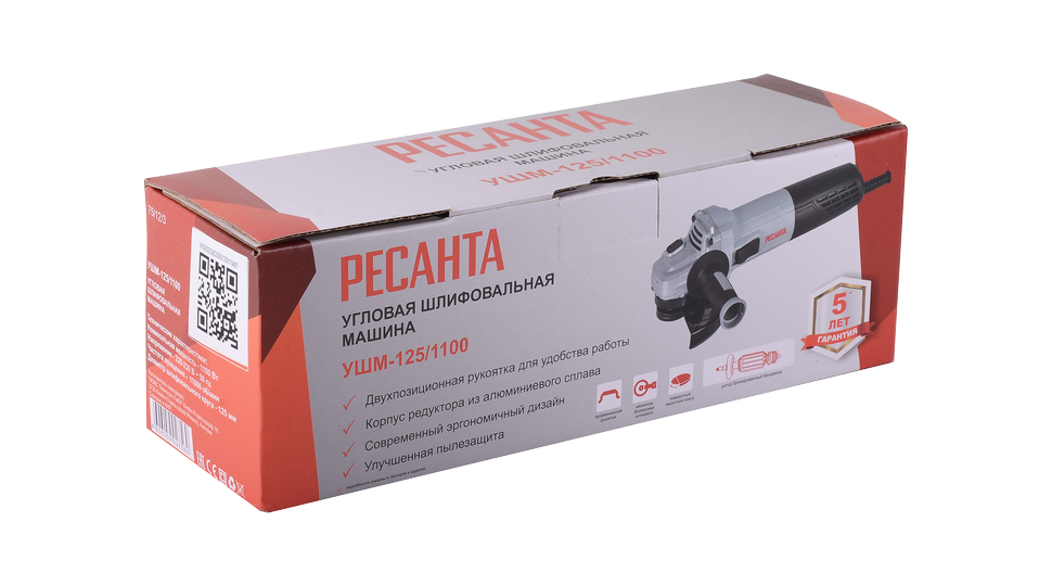 В модели Ресанта УШМ-125/1100 скорость вращения вала достигает 11000 об/мин. Электродвигатель 1100 Вт заключен в пластиковый корпус с вентиляционными отверстиями для эффективного охлаждения двигателя. Корпус редуктора УШМ выполнен из алюминиевого сплава для более долговечной эксплуатации. Изолированная компакт-рукоятка может быть установлена справа или слева. Конструкция клавиши включения УШМ защищает от случайного пуска.