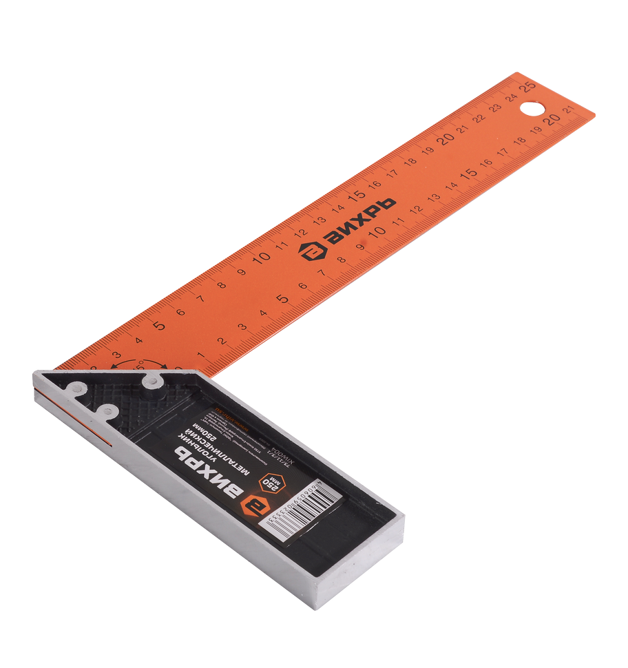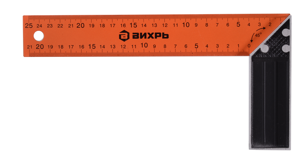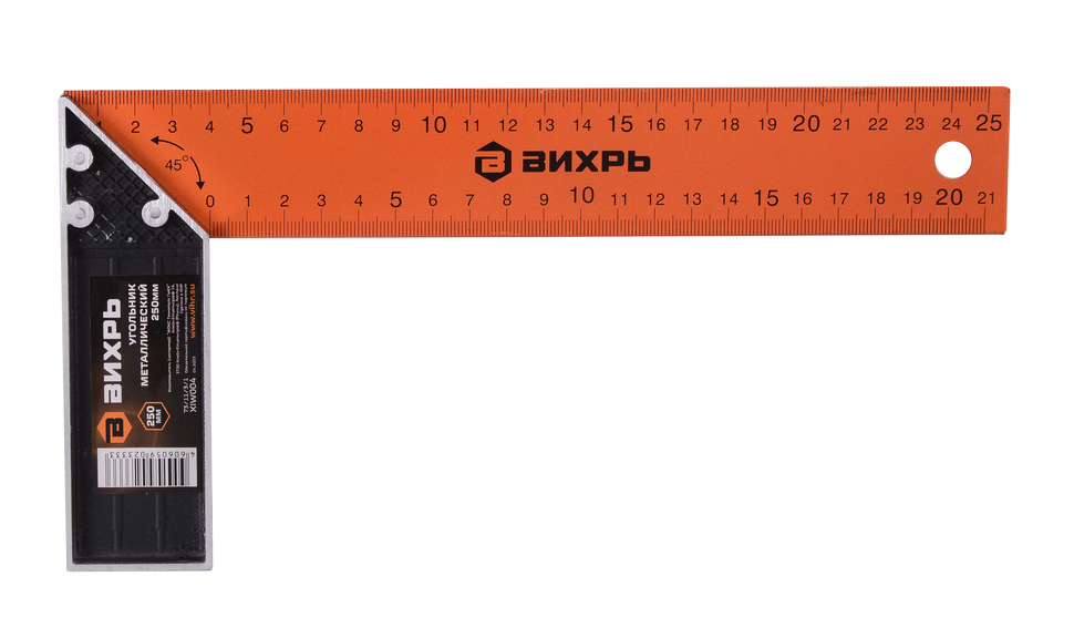 Угольник металлический ВИХРЬ 250 мм используется для измерения расстояния и определения углов 45° и 90°. Он состоит из двух элементов, которые соединены под прямым углом. Его наружная длина 25 см и внутренняя - 21 см. Металлическое основание окрашено для защиты от коррозии.