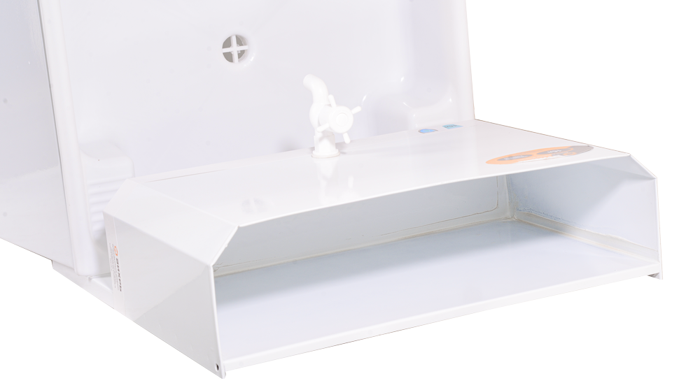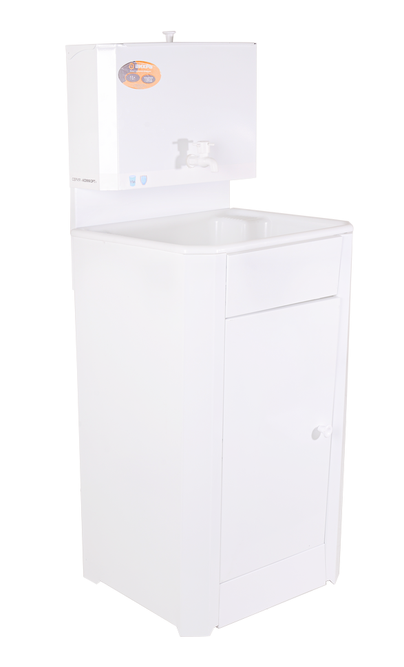 В конструкцию умывальника входит пластиковая мойка, бак с пластиковым краном, тумба, сливная труба. Мойка имеет достаточную глубину, чтобы удобно размещать и мыть в ней посуду, фрукты. С помощью входящей в комплект трубы воду можно сливать в емкость, установленную внутри тумбы, или подключить умывальник к канализации. Тумба оснащена большой дверцей, через которую свободно вынимается ведро или бак для слива отработанной жидкости. Бак вмещает 16 л воды, этого достаточно для покрытия потребностей 1-3 человек в течение дня.