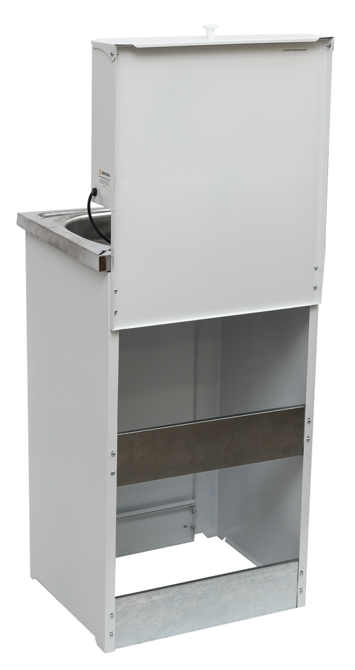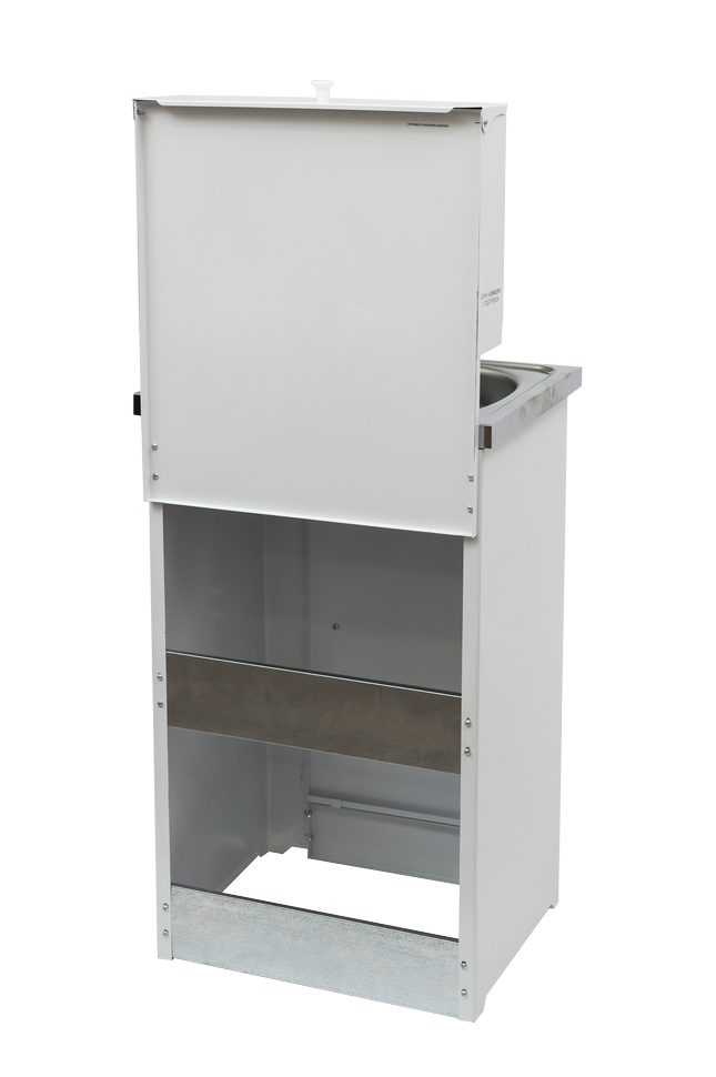 Корпус умывальника выполнен из стали толщиной 0,7 мм, устойчивой к механическим повреждениям. Покрытие порошковой краской защищает от образования коррозии. Увеличенная высота тумбы и дверцы позволяет устанавливать емкость для использованной воды большого объема и легко ее вынимать. Накладная мойка из нержавеющей стали неприхотлива в уходе, надолго сохраняет эстетичный внешний вид. Кран для подачи воды выполнен из прочного пластика.