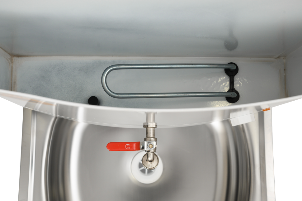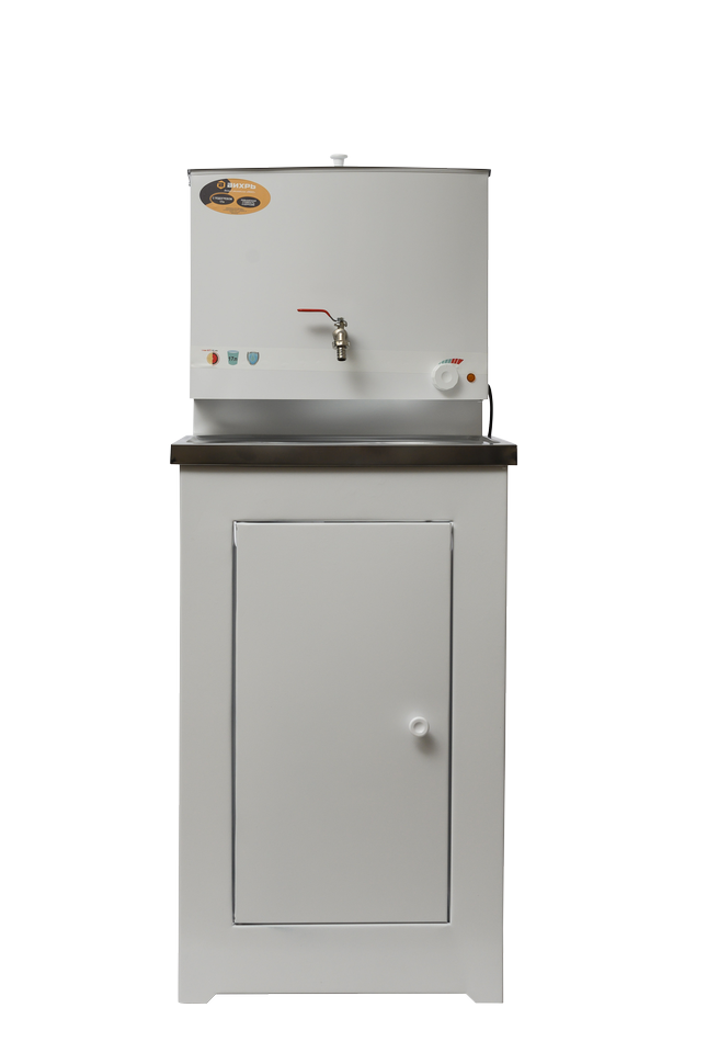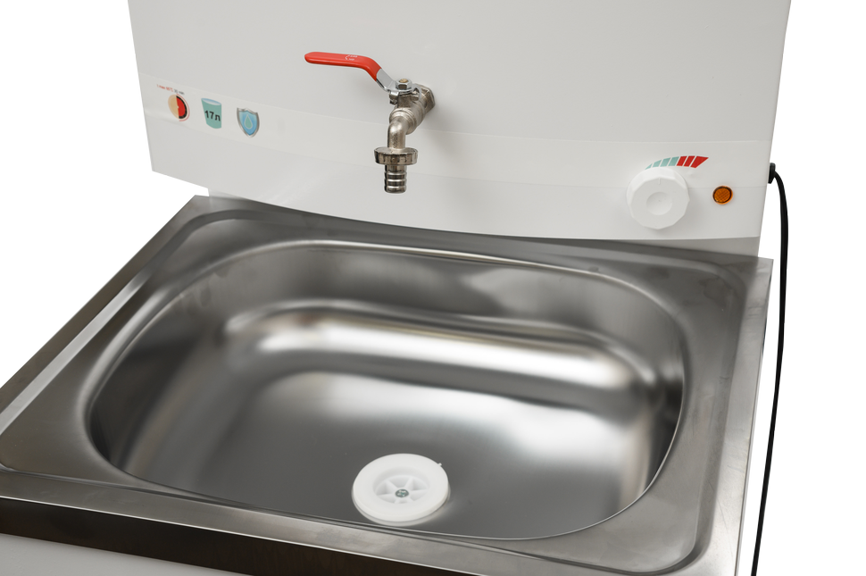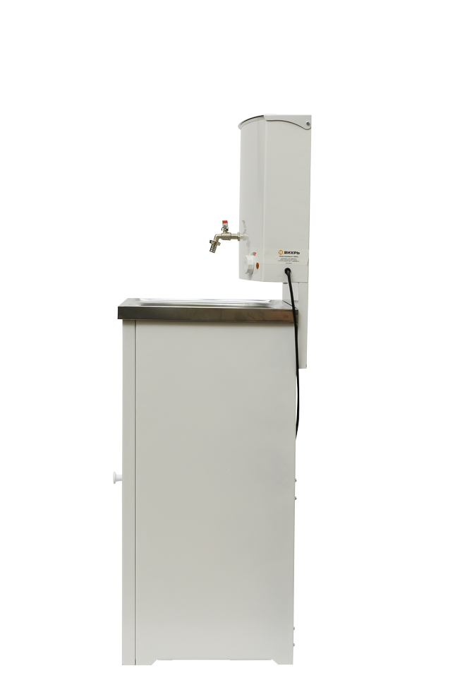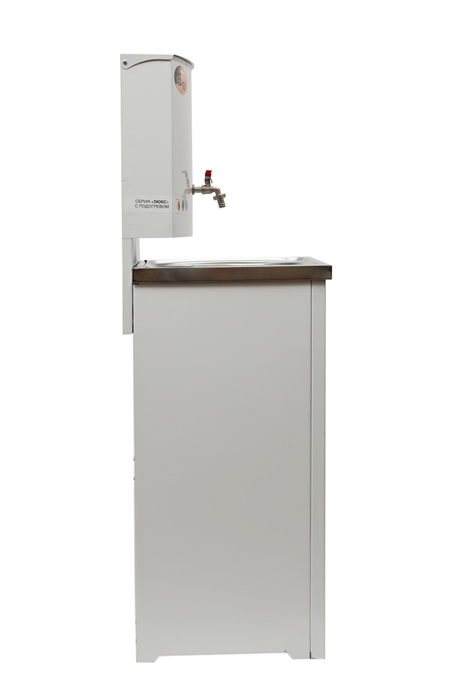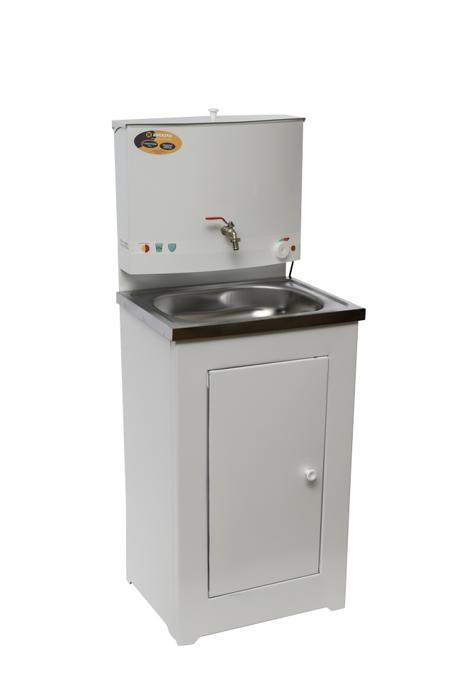 Модель состоит из тумбы и бака емкостью 17 л, в котором установлен ТЭН мощностью 1300 Вт. На бачке имеется кран, с помощью которого можно плавно регулировать напор воды. Наличие терморегулятора позволяет выбрать оптимальную температуру нагрева. На тумбе установлена раковина из нержавеющей стали со сливом. Сливную трубу можно вывести в канализацию или специальную емкость, которая устанавливается внутри тумбы и легко вынимается через большую дверцу.