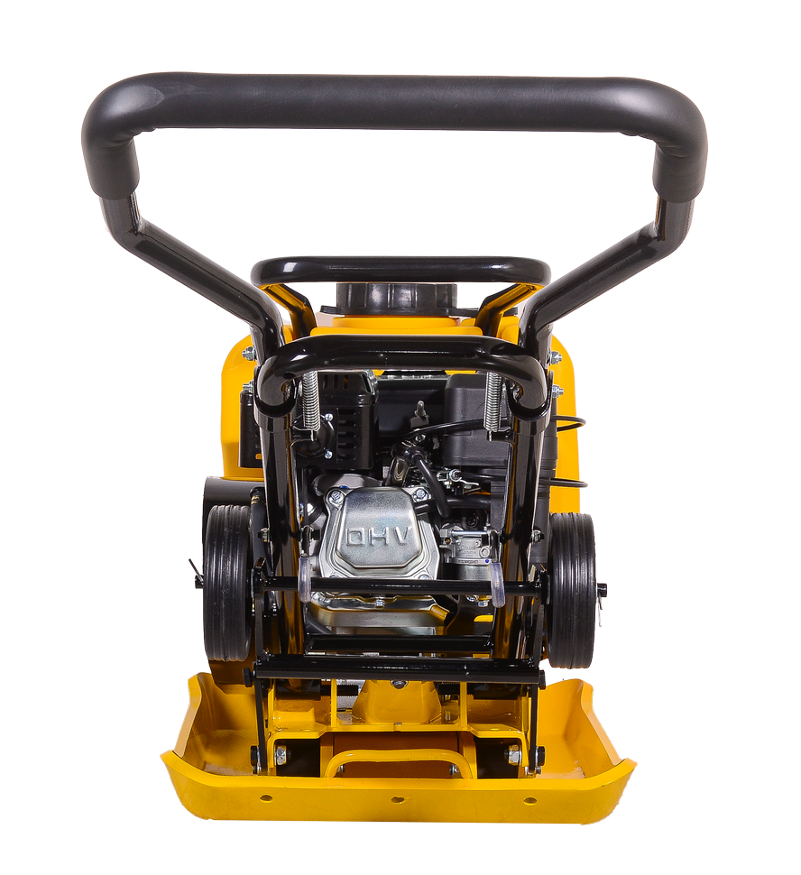 Конструкция максимально продумана для комфортности эксплуатации. Устройство оснащено прочной металлической рукояткой с виброгасящей накладкой и выведенным на нее рычагом газа. Все элементы конструкции расположены в пределах доступности, металлические поверхности защищены от коррозии специальным покрытием. Наличие 2 передаточных ремней повышает надежность и увеличивает срок службы агрегата. Бензиновая виброплита оснащена виброгасящими демпферами, предотвращающими передачу вибраций от плиты к двигателю. Крепление вибратора к плите осуществлено посредством сварки. Модель имеет съемные колеса для удобства перемещения.