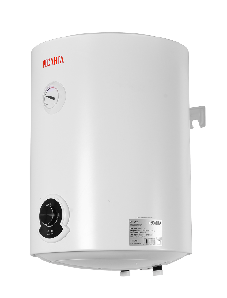 Накопительный водонагреватель Ресанта ВН-30К используют для подогрева холодной воды, поступающей из водопровода. Он может использоваться как в период профилактических отключений, так и в домах с постоянно отсутствующим ГВС.
