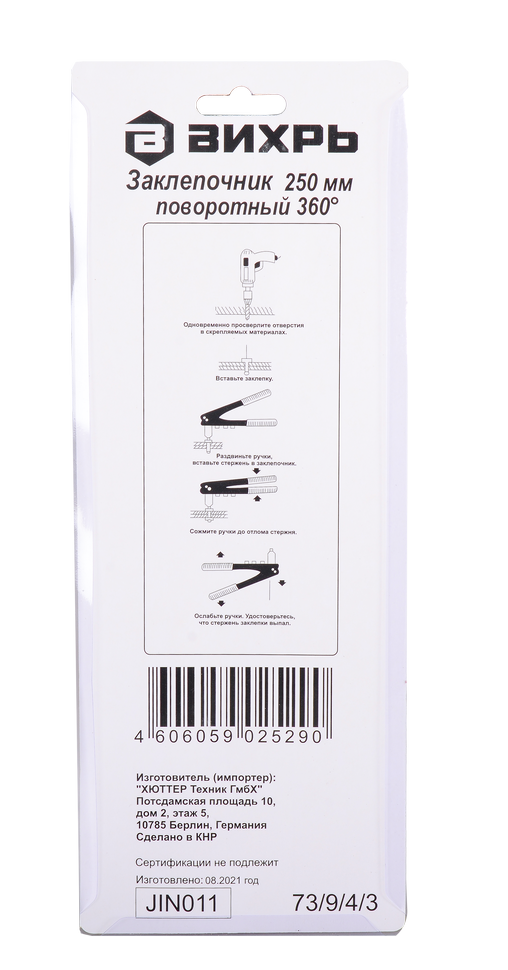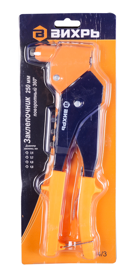 Заклепочник ВИХРЬ 250 мм поворотный 360 - инструмент, предназначенный для установки заклепок различных диаметров. Он имеет удобную эргономичную рукоятку, которая обеспечивает комфортную работу в течение длительного времени. Специальный замок закрепляет рукоятку в сложенном состоянии для компактного хранения.