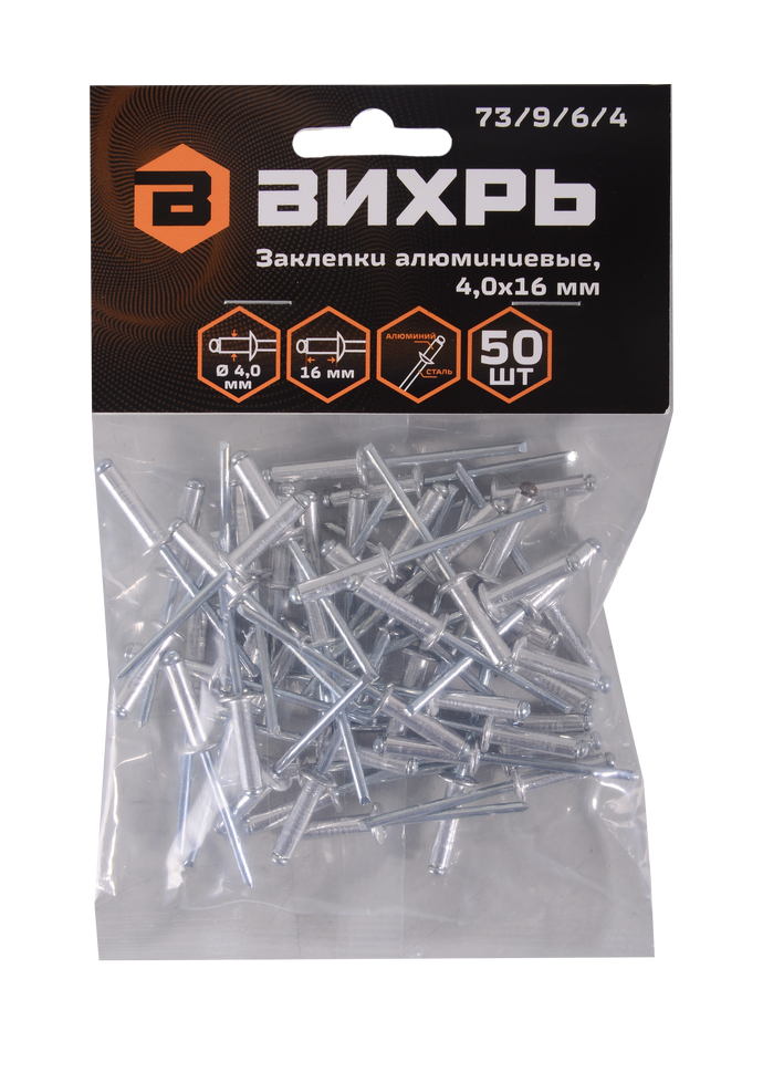 Заклёпки алюминиевые Вихрь 4,0х16 мм имеют диаметр 4.0 мм и длину гильзы 16 мм. В упаковке 50 штук.