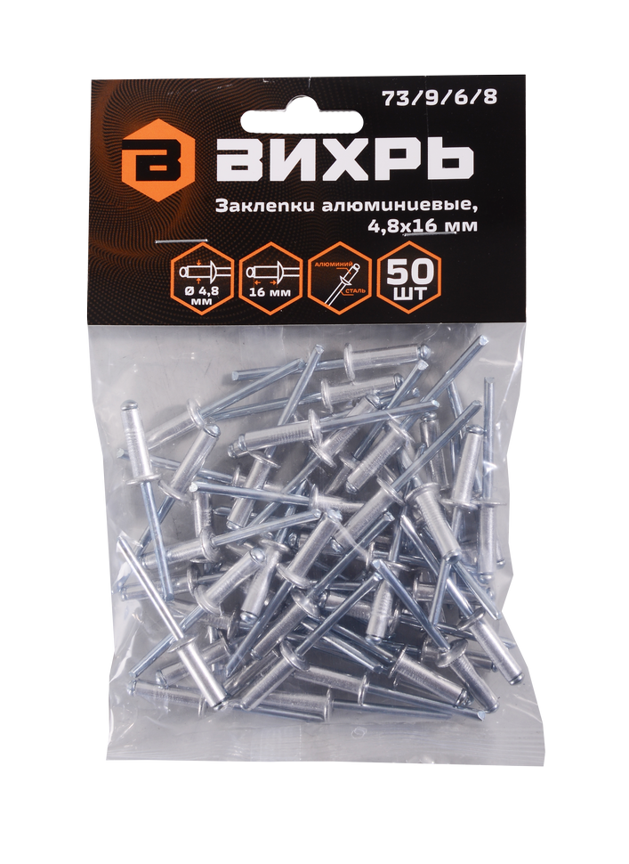 Заклёпки алюминиевые Вихрь 4,8х16 мм имеют диаметр 4.8 мм и длину гильзы 16 мм. В упаковке 50 штук.