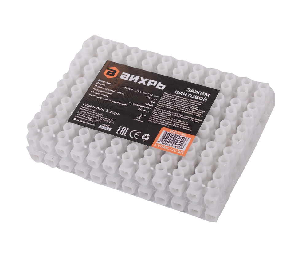 Зажим винтовой применяется для безопасного и надежного соединения проводников, защищая провод от повреждения и исключая возможность замыкания на корпус электроустановки. Используется в электрических цепях с номинальным напряжением до 400В и частотой 50 Гц. Соединение осуществляется с помощью латунных контактов. Жила кабеля или провода фиксируются винтовым зажимом.