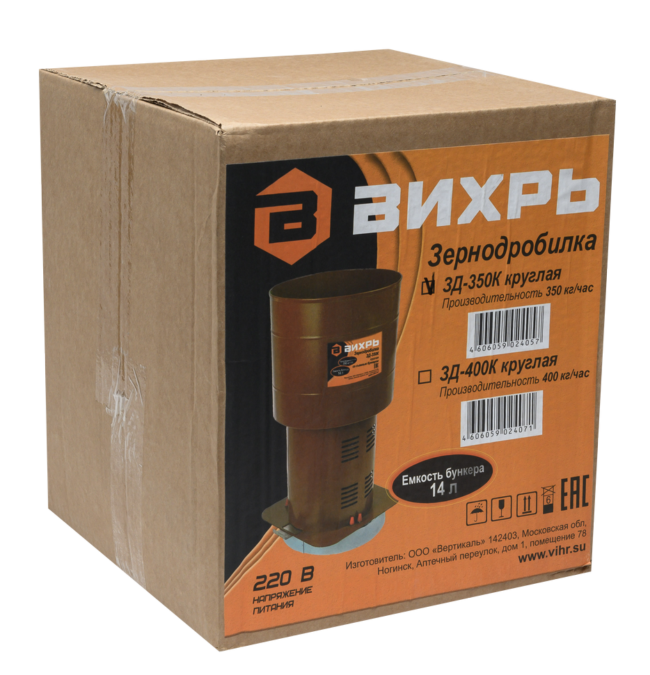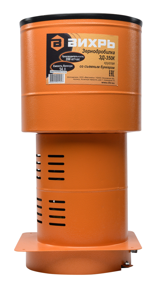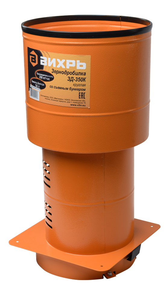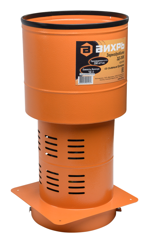 Измельчитель зерна ВИХРЬ ЗД-350К предназначен для приготовления кормов сельскохозяйственным животным путем измельчения сухого фуражного зерна. Мощность коллекторного двигателя составляет 1350 Вт. Скорость вращения ножа 12 000 об/мин обеспечивает высокую производительность до 350 кг/ч. После размола зерно пробивается через сито. Конструкция состоит из съемного загрузочного отсека вместимостью 14 л, моторного отсека и камеры для измельчения. Агрегат работает от однофазной электросети. Зернодробилка устанавливается на емкость, куда попадает готовый корм. Округлая форма конструкции позволяет использовать для этого ведро или бак.